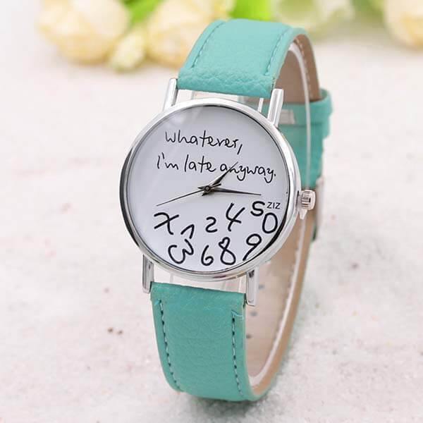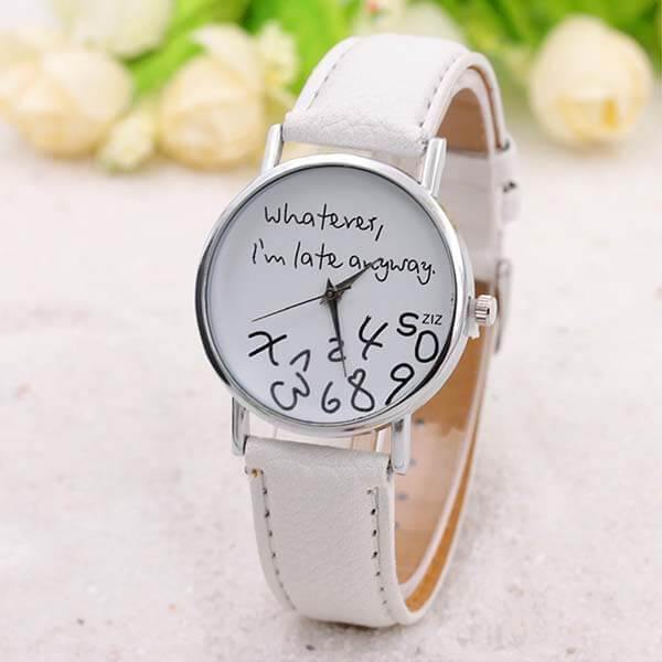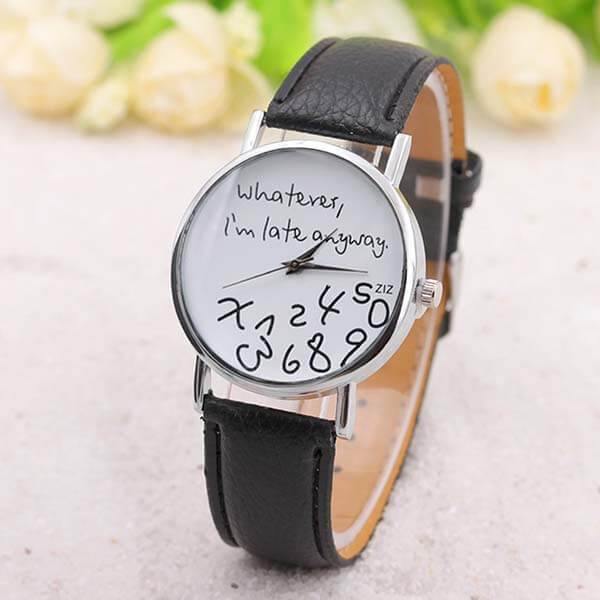 - Estampa "Que seja, eu estou atrasada mesmo." no relógio: único e diferente